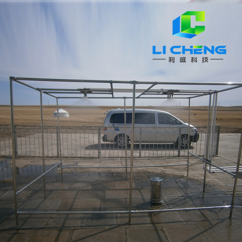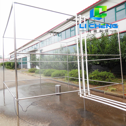噴霧單元由供水管路、直管段、噴嘴、支架等組成,噴嘴采用世界上專業(yè)生產模擬雨滴噴頭的美國SPAYING SYSTEMS公司生產的FULLJET旋轉下噴式噴嘴,不銹鋼材質,噴嘴和直管段集成在一起,噴霧支架為不銹鋼方管結構,用來架設供水管路和噴嘴。