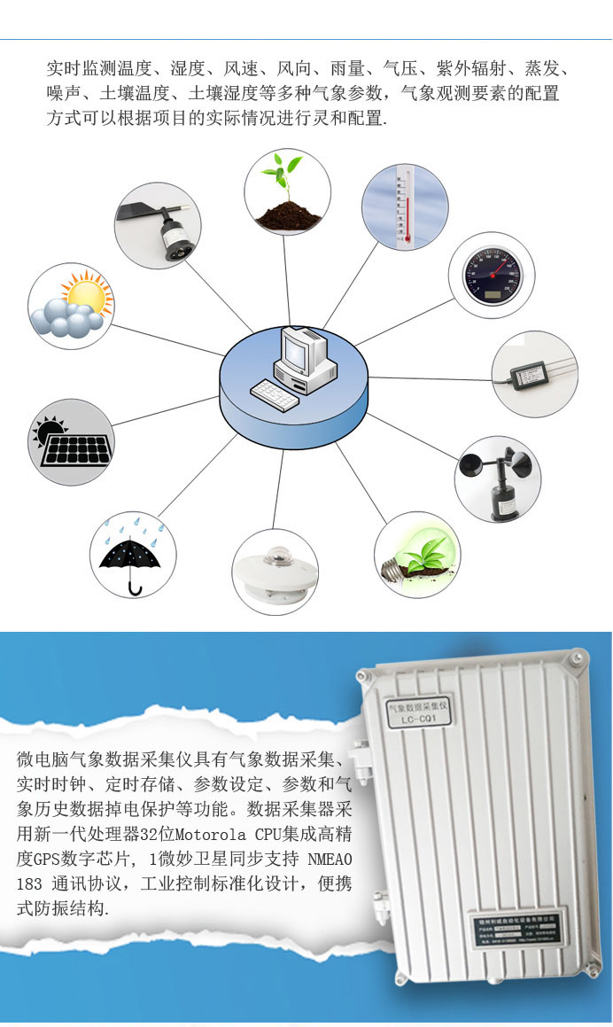 2、微電腦氣象數(shù)據(jù)采集儀具有氣象數(shù)據(jù)采集、實時時鐘、定時存儲、參數(shù)設(shè)定、參數(shù)和氣象歷史數(shù)據(jù)掉電保護等功能。數(shù)據(jù)采集器采用新一代處理器32位Motorola CPU集成高精度GPS數(shù)字芯片, 1微妙衛(wèi)星同步支持 NMEA0183 通訊協(xié)議,主動型陶瓷天線讓定位更為精準,通過氣象監(jiān)測軟件可以準確定位查看監(jiān)測區(qū)域的氣象環(huán)境數(shù)據(jù),方便于移動觀測氣象數(shù)據(jù),工業(yè)控制標準化設(shè)計,便攜式防振結(jié)構(gòu),漢字液晶鍵盤人機界面,使用先進的雙屏顯示技術(shù),主屏顯示實時氣象數(shù)據(jù)信息,輔屏顯示地理狀況信息包括方位、高度、天氣預(yù)報資料等等,人機界面友好,便于現(xiàn)場實時查看氣象分析數(shù)據(jù),無需外接電腦終端設(shè)備。