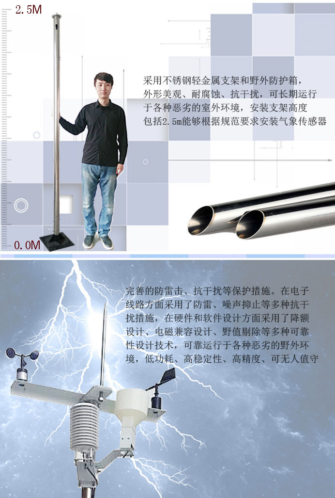 6、采用不銹鋼輕金屬支架和野外防護箱,外形美觀、耐腐蝕、抗干擾,可長期運行于各種惡劣的室外環(huán)境,安裝支架高度包括2.5m能夠根據(jù)規(guī)范要求安裝氣象傳感器。