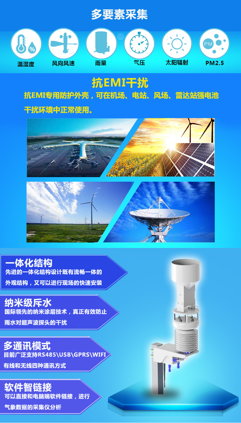 1、輸出2~10個氣象要素: 大氣溫度、環(huán)境濕度、風向和風速、降雨、氣壓、太陽輻射、PM2.5、土壤溫度、土壤濕度、氣體濃度